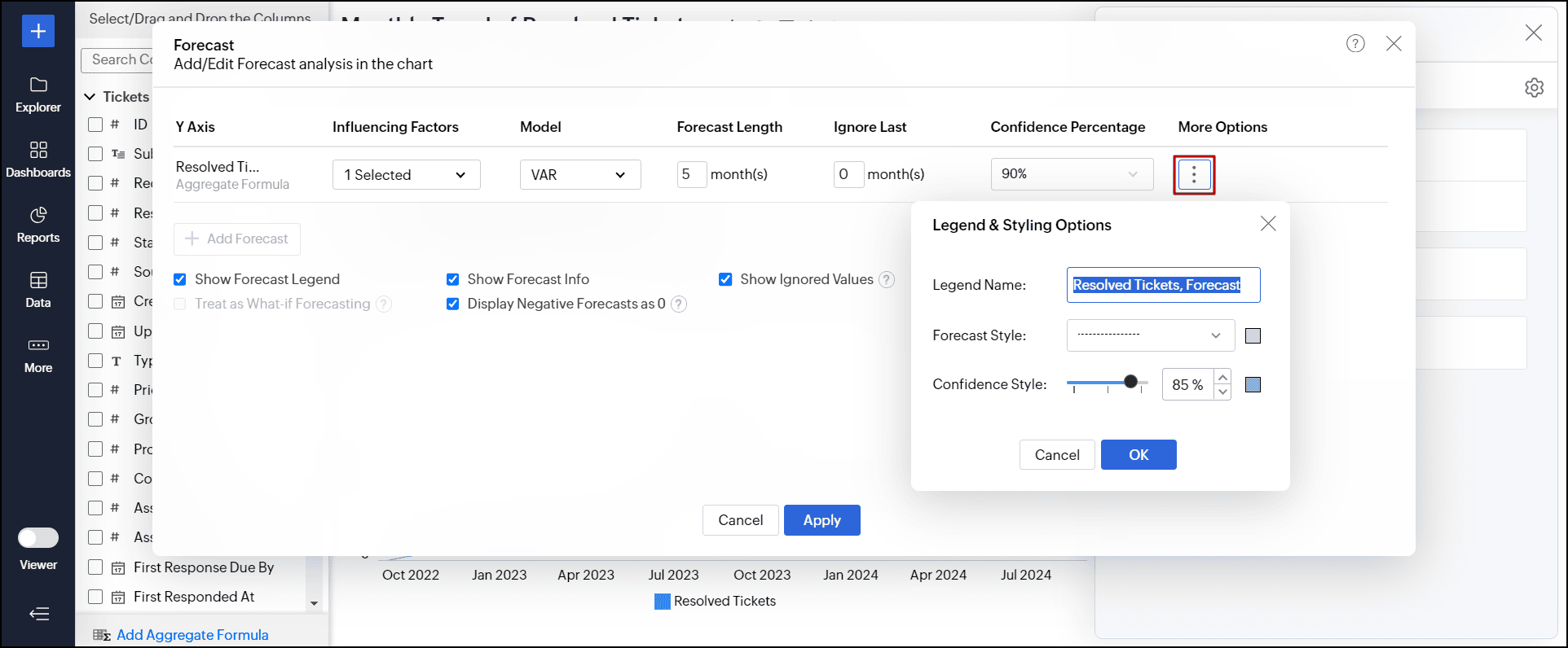 4. Select the dependent factors (columns) for prediction from the Influencing Factors drop-down. It helps to enhance the accuracy of forecasting by accounting for closely related factors that affect the metric being forecasted. For instance, including influencing factors like the availability of technicians or the average resolution time of individual technicians in this example can help achieve more precise forecasts. You can add a maximum of five influencing factors to forecast data.