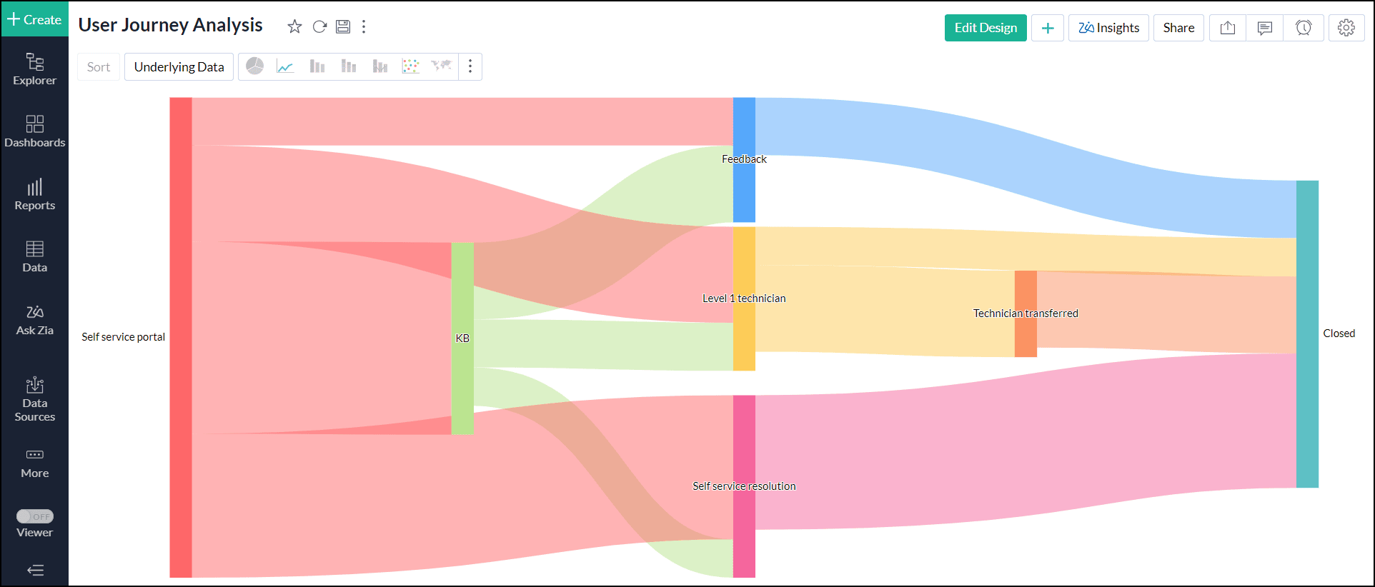 A Sankey chart is a visualization that shows the directional flow of processes and activities from an initial node to a terminal point through interconnected lines. The width or thickness of the interconnecting lines is proportional to the flow rate. The width of each connecting line is determined by the value of the corresponding pairing, relative to other values present in the data.