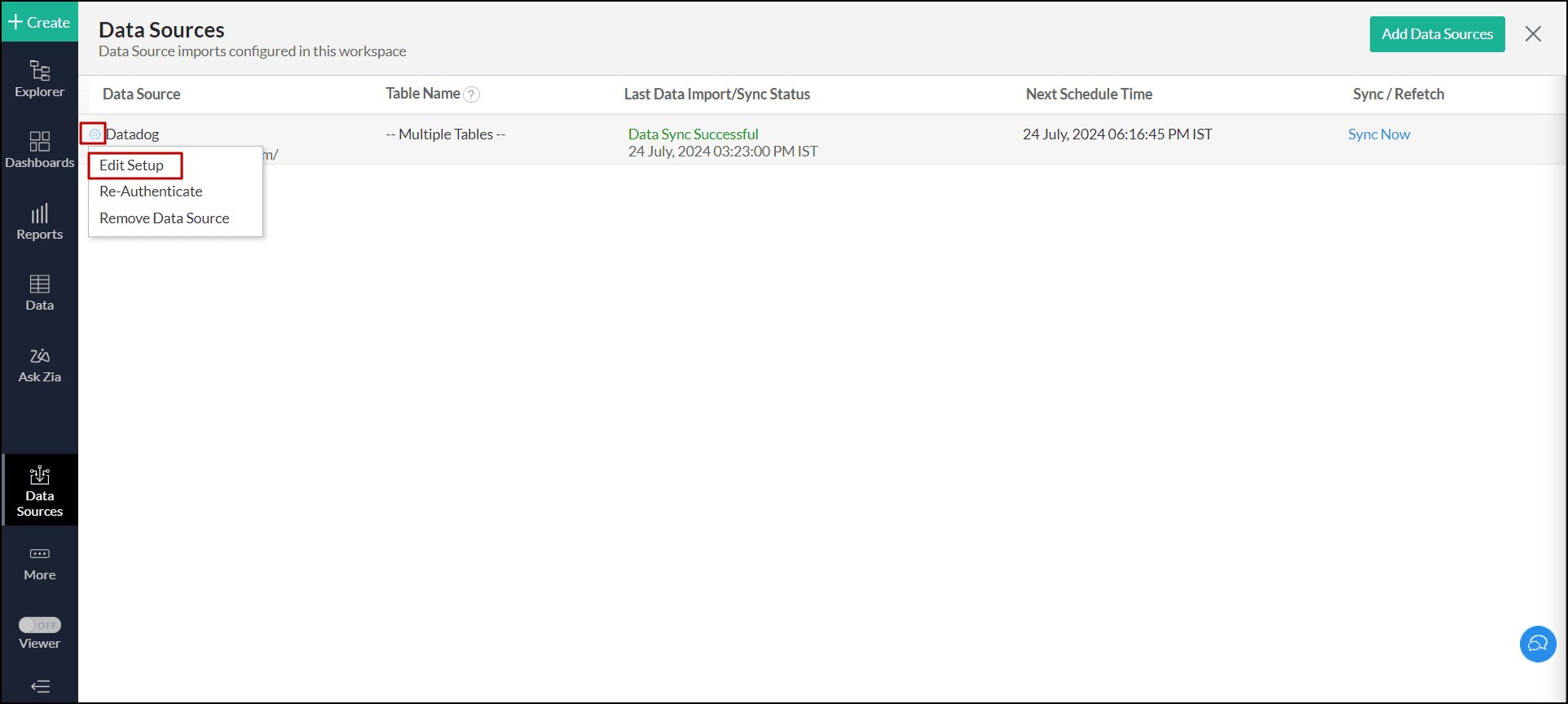 1. Click the Settings icon that appears on the mouse over the Datadog data source and click the Edit Setup option.