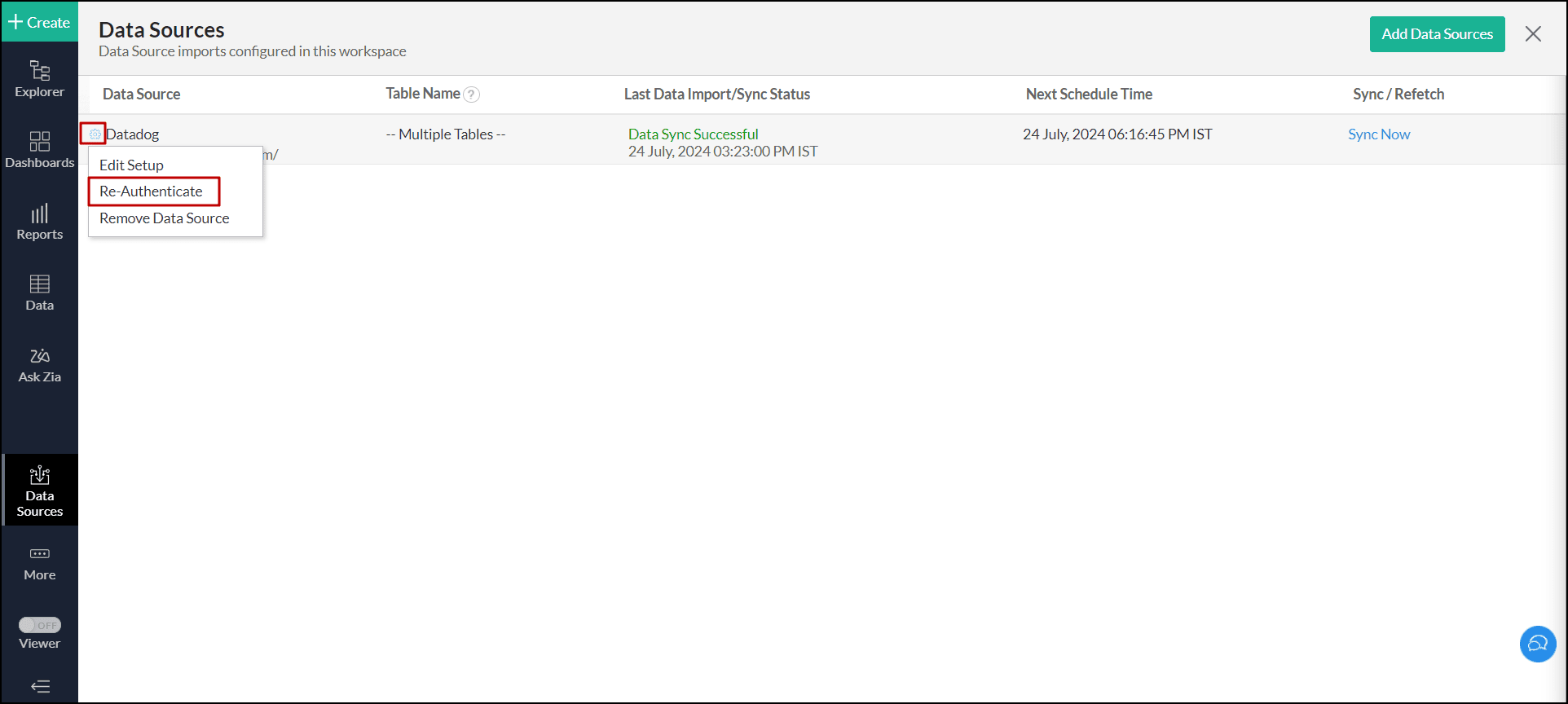 2. Navigate to the Datadog data source, and click the Re-Authenticate link.