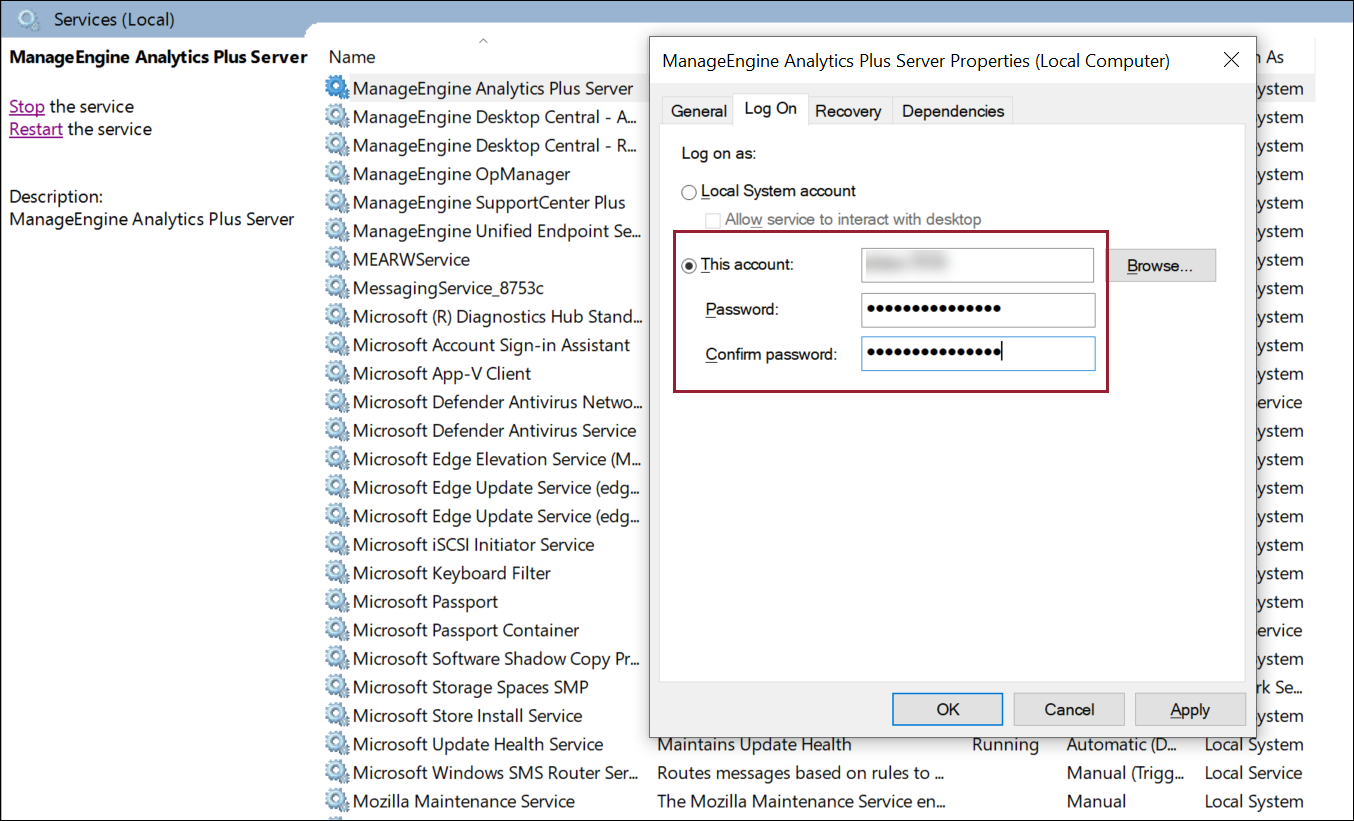 To restart Analytics Plus with admin privileges, open the Services window and navigate to the ManageEngine Analytics Plus listing. Right-click on the service name, select the Properties option and head to the Log on tab. Enter your administrator credentials, and click the Apply and OK buttons to reflect the change.