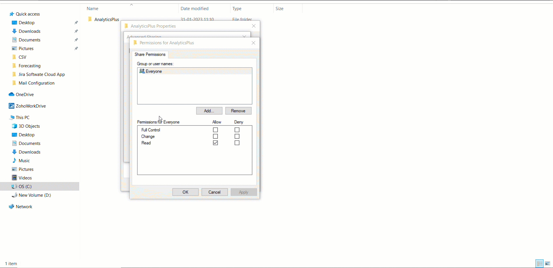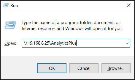 - To verify the shared folder access, open the Run dialog and type \\<IP>\AnalyticsPlus from another server (i.e., If you are sharing the AnalyticsPlus folder present in the primary server, try accessing it from the standby server and vice versa).