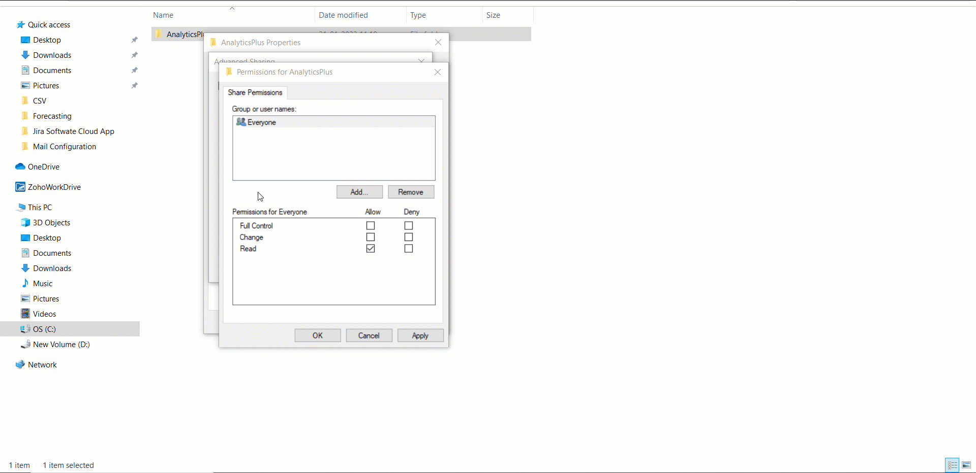 - Navigate to the <Analytics Plus home folder>, right-click the folder, and select Properties.