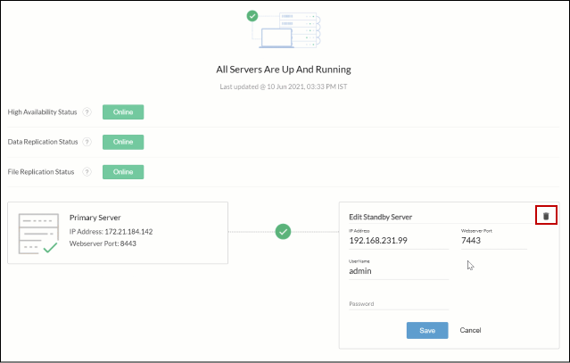 To remove the high availability configuration, navigate to the Settings page and head to the High Availability tab. Click the Edit icon that appears on mouse over the standby server's details, and click Remove. Confirm your action in the popups that appear to delete the high availability configuration.
