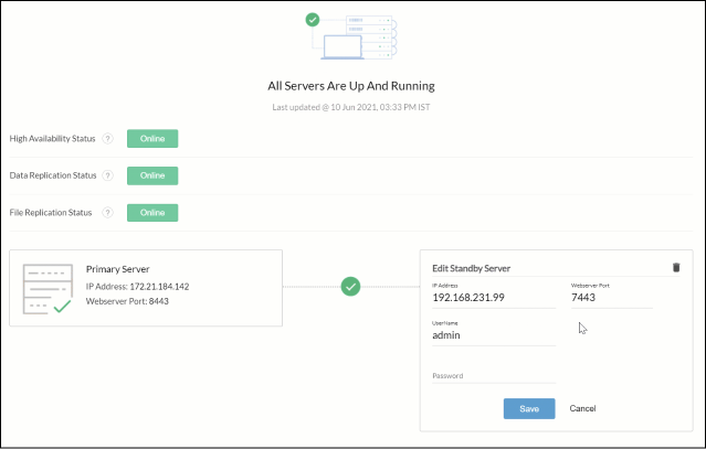 Navigate to the High Availability section in the Settings page, click the Edit icon that appears (on mouse hover) over the standby server details. Change the username, password or port number, and click Apply.