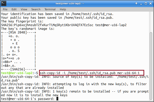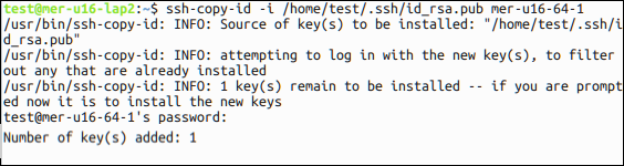 - Copy the generated public key to the standby server using the ssh-copy-id -i <key-file-path>id_rsa.pub <standby-machine-name> command. <key-file-path> refers to the directory where the generated public key is saved.