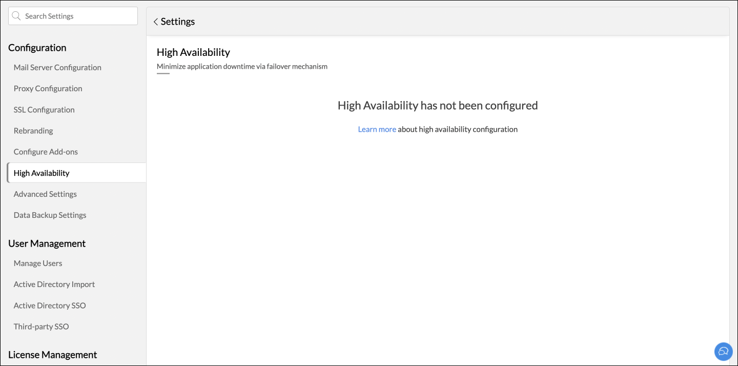 - Open your Analytics Plus application, and navigate to the High Availability section in the Settings page.