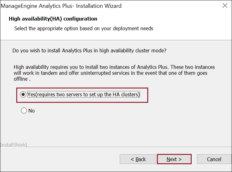 During the Analytics Plus installation process, select the Yes radio button in the High Availability Configuration screen, and click Next to begin setting up the high availability functionality.