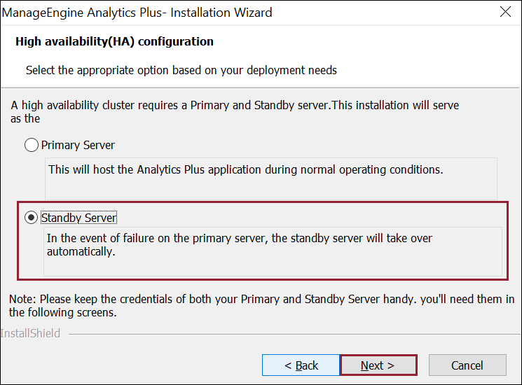 - During the installation process, select the Standby Server radio button in the High Availability (HA) configuration screen, and click Next to proceed.