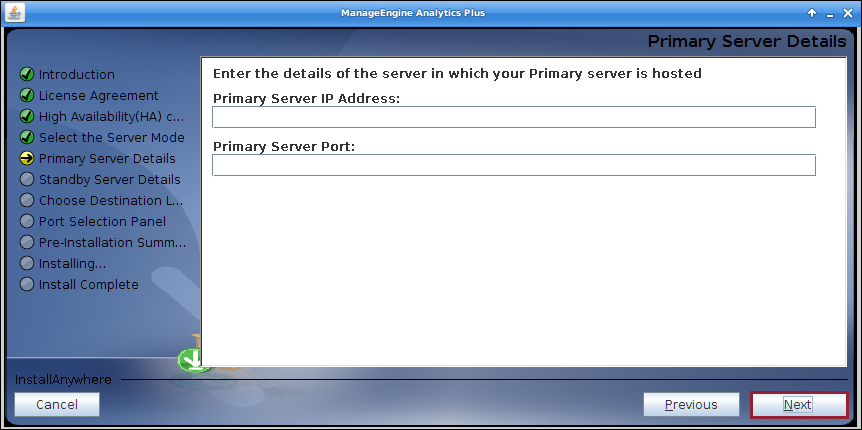 - Enter the primary server's static IP address and port number, and click Next to proceed with the installation process.