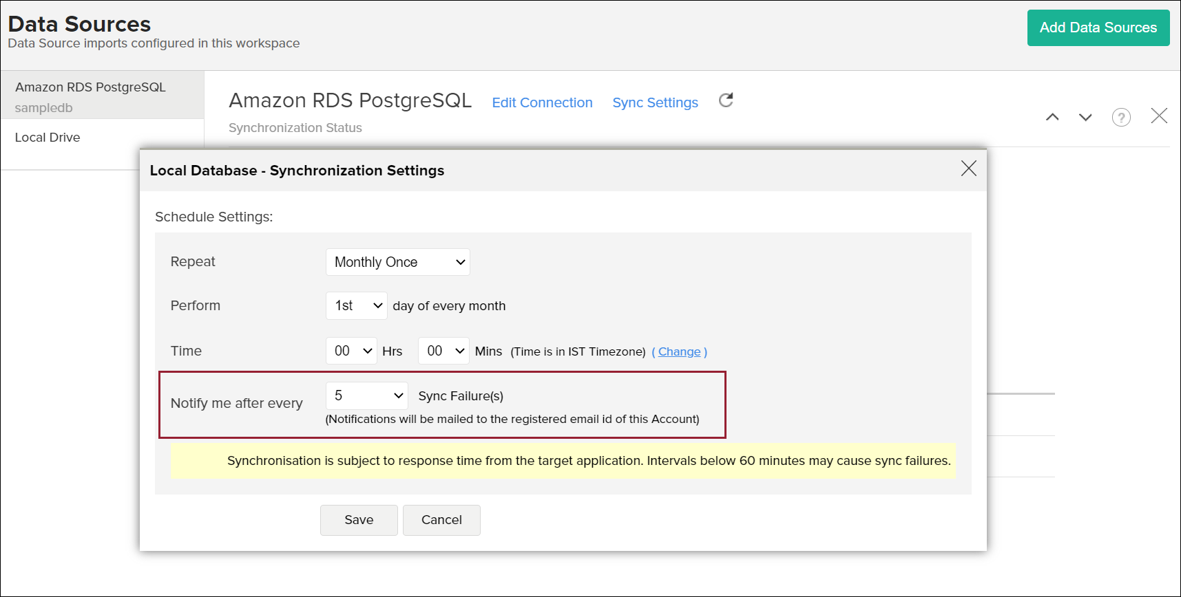 Specify the number of consecutive import failure after which you are to be notified in the Notify me after every 'N' Sync Failure (s) section.