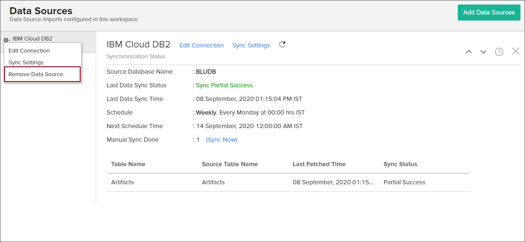 Note: Removing the data source does not delete the corresponding tables and reports from Analytics Plus. However, further synchronization cannot be carried out.