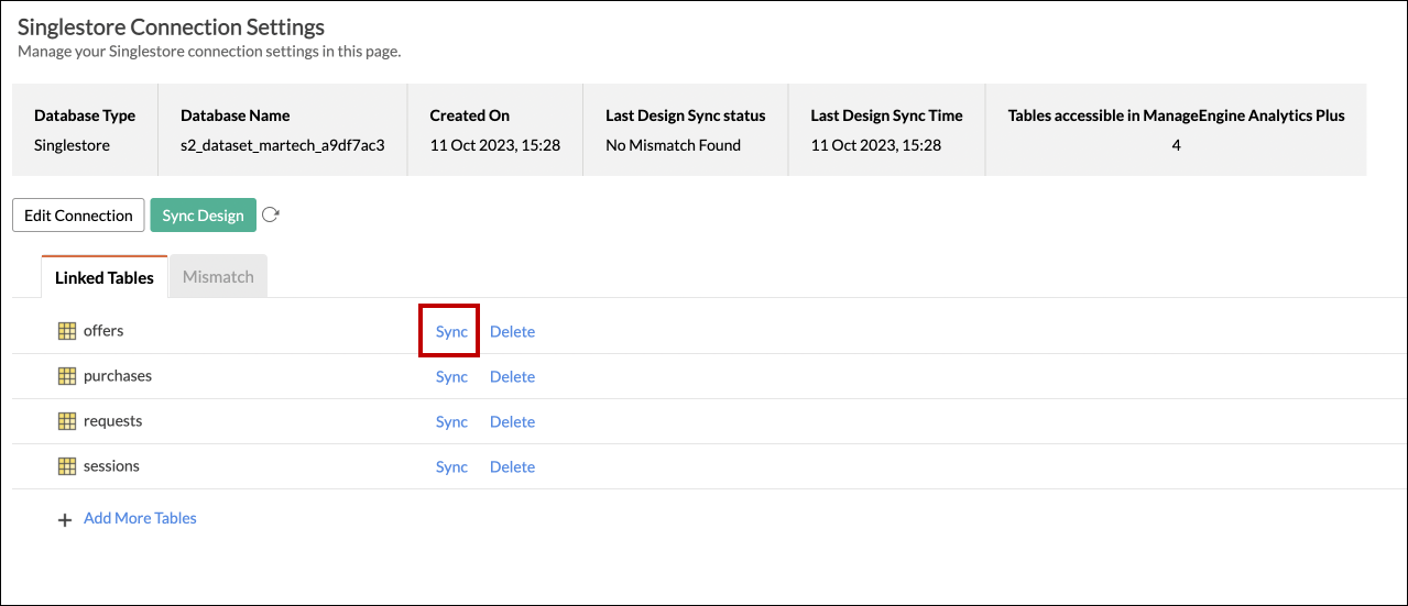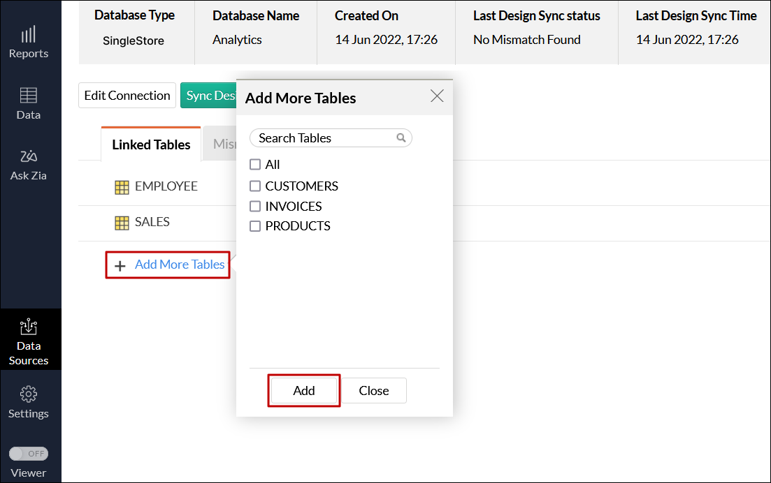 Note: In case of mismatches, you will not be able to add new tables. The mismatches need to be resolved first. Click here to know more about resolving mismatches.