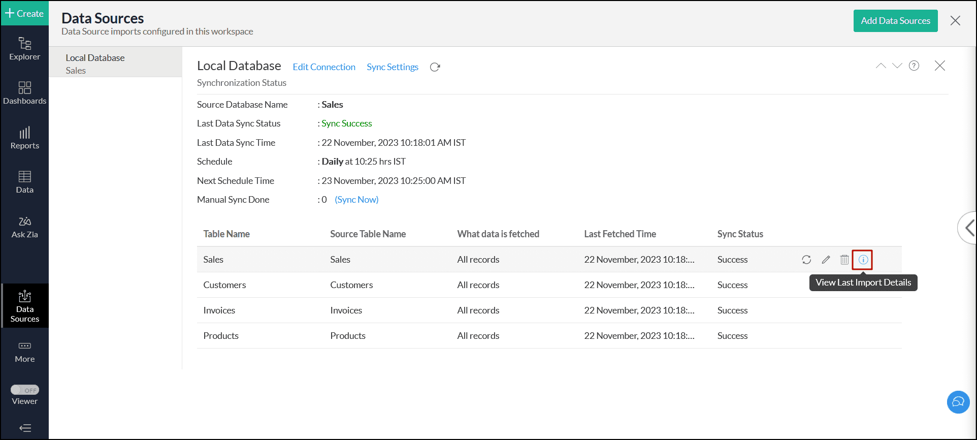 • Click the View Last Import Details icon that appears on mouse over the listed tables. This opens the Import Details page, which provides detailed insight on the reason for the synchronization failure.