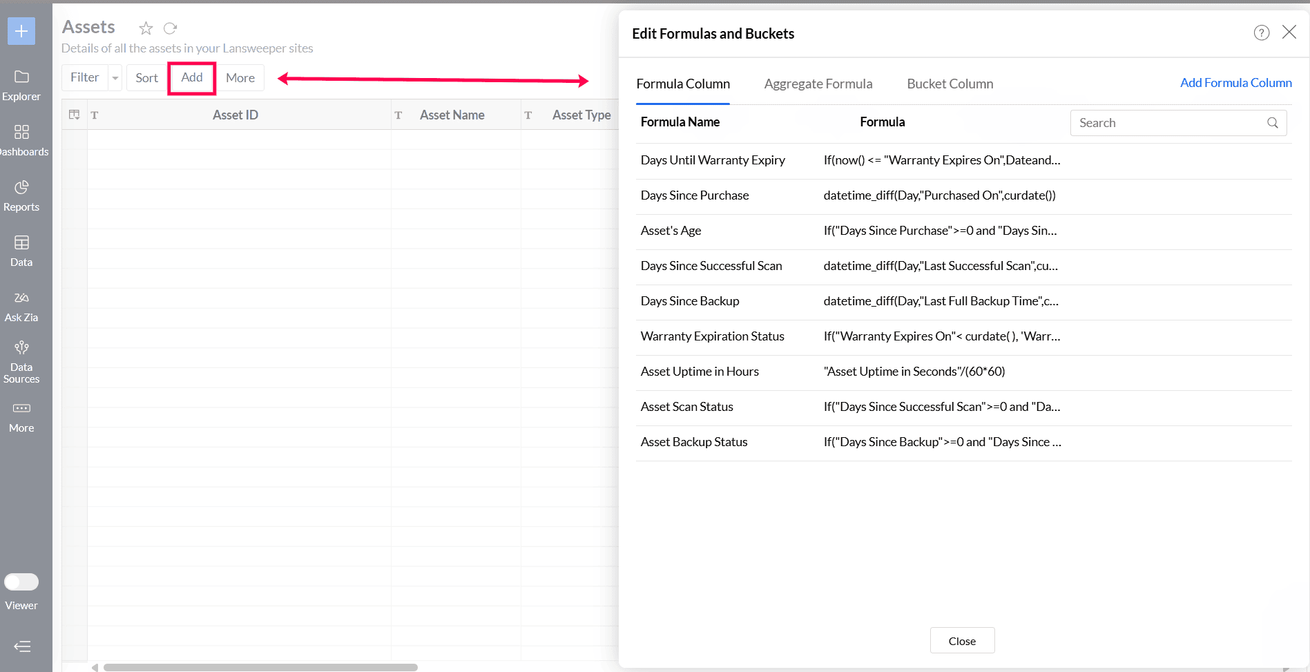 Formulas are calculations that can be defined using the powerful formula engine in Analytics Plus to create required reports. Refer to this documentation to know more. There are also several default formulas created based on the Lansweeper modules. To view the default formulas, open the required table, click Add, and select the Edit Formulas option.