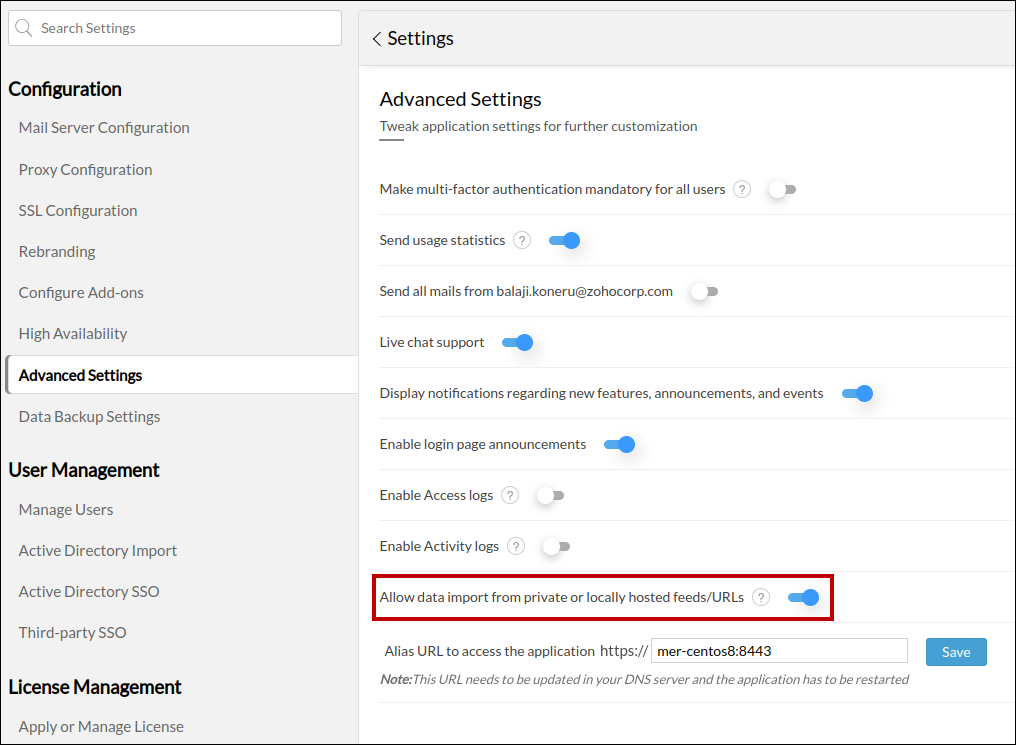 • Allow data import from private or locally hosted feeds/URLs - This option allows users to fetch data from a URL that is hosted within a private network/LAN. This feature is enabled by default and can be disabled using the toggle button. Turning off this option will allow admins to restrict data import from confidential data hosted in the private network.