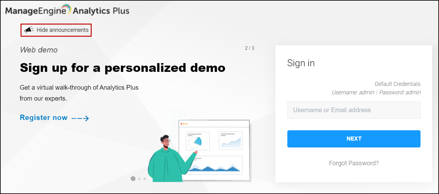 • Enable login page announcements: Administrators can enable this option to display various product-related announcements on upcoming webinars, e-books and more across every Analytics Plus users' login page. Individual users can also choose to hide these announcements by clicking the Hide announcements option. However, other Analytics Plus users will continue to view the login page announcements untill the administrator disables this option.