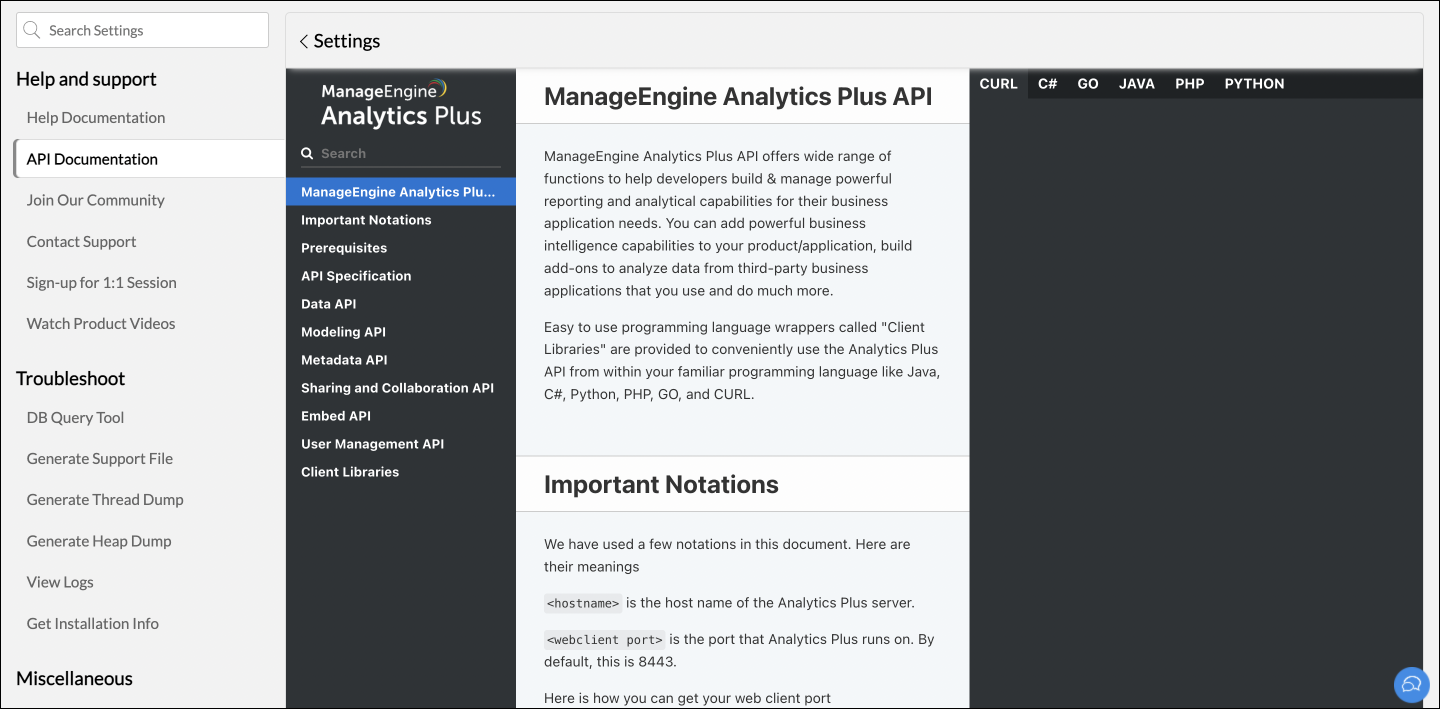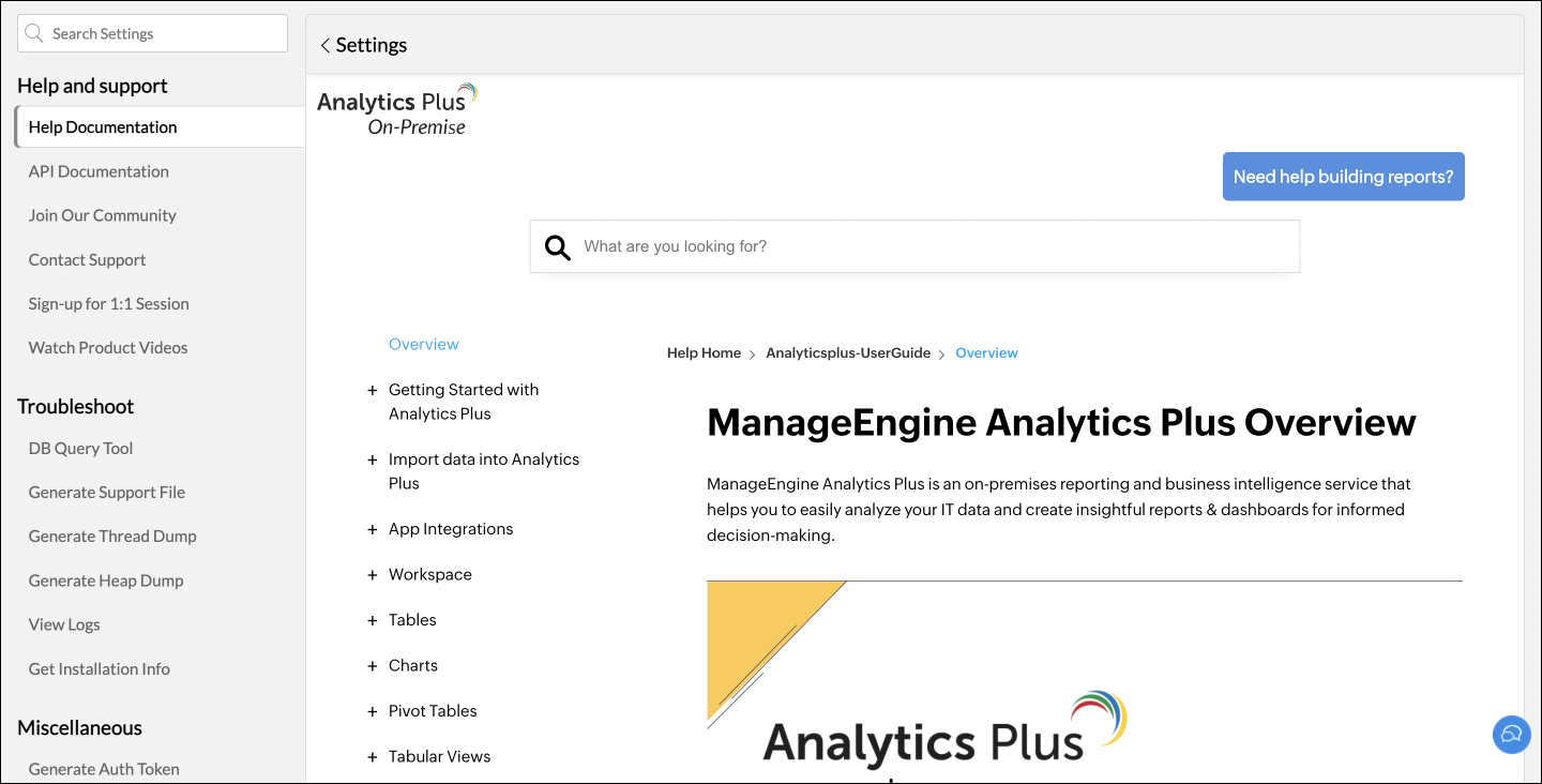 • Open Settings by clicking on the Settings icon present in the top right corner of the ManageEngine Analytics Plus product.