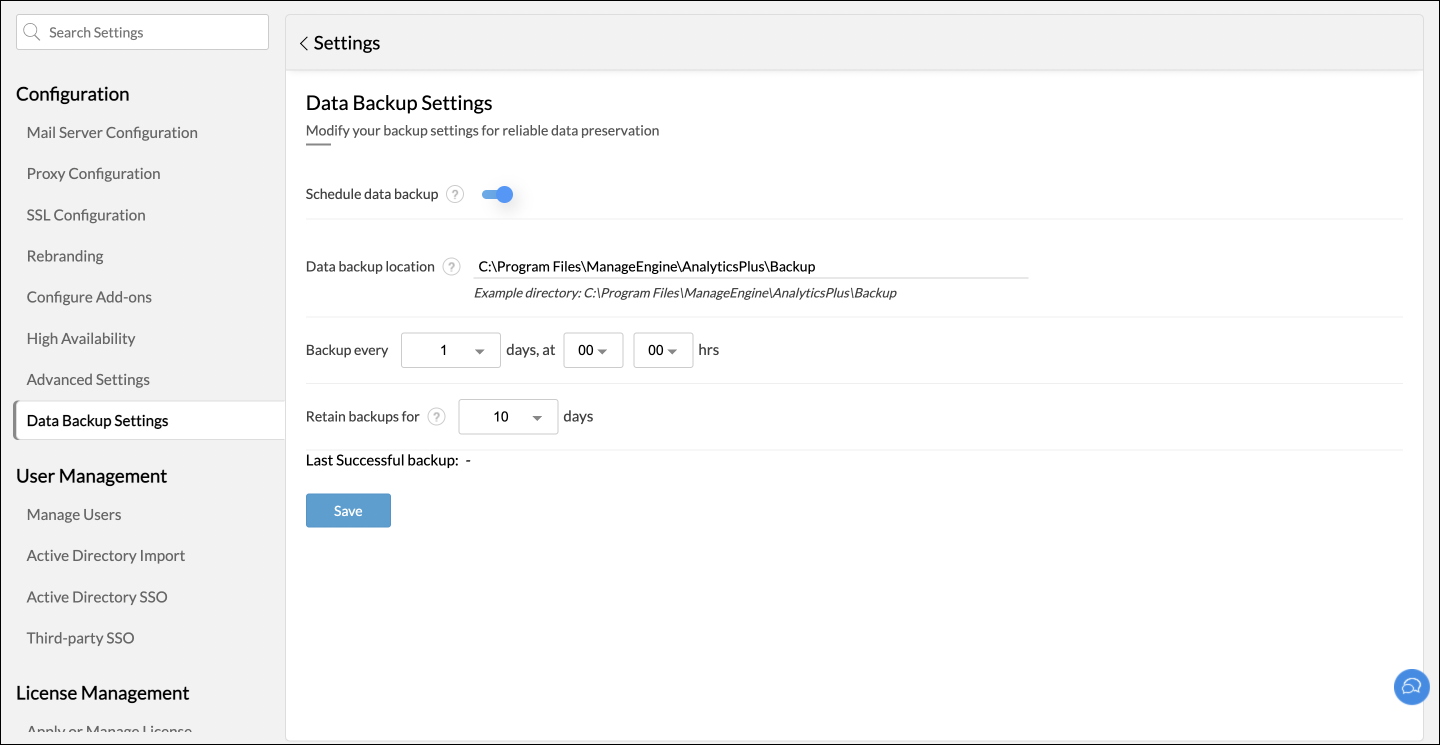The Data Backup Settings section allows you to schedule periodic backups of your Analytics Plus application with ease. Follow the steps below to schedule a data backup: