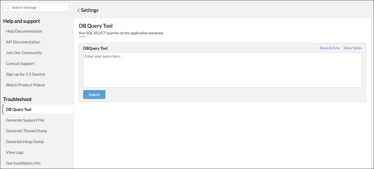 DB Query Tool: Run SQL SELECT queries on the application database. Enter the query and click Submit.