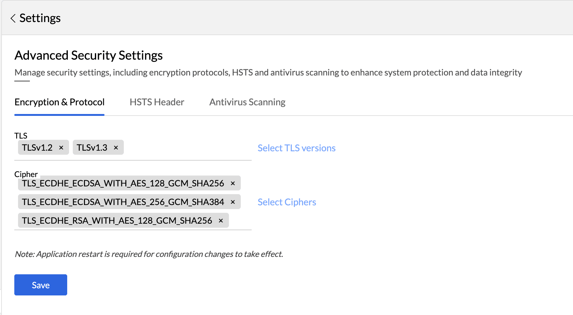 Configure advanced security options such as encryption, HSTS and antivirus scanning to enhance data protection and secure user access in Analytics Plus.
