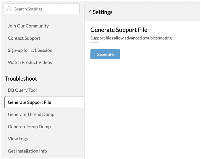 Generate Support File: Click Generate to generate a support file that allows advanced troubleshooting.