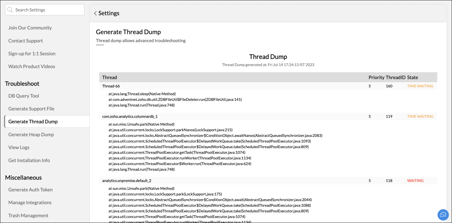 Generate Thread Dump: Thread dump allows advanced troubleshooting.