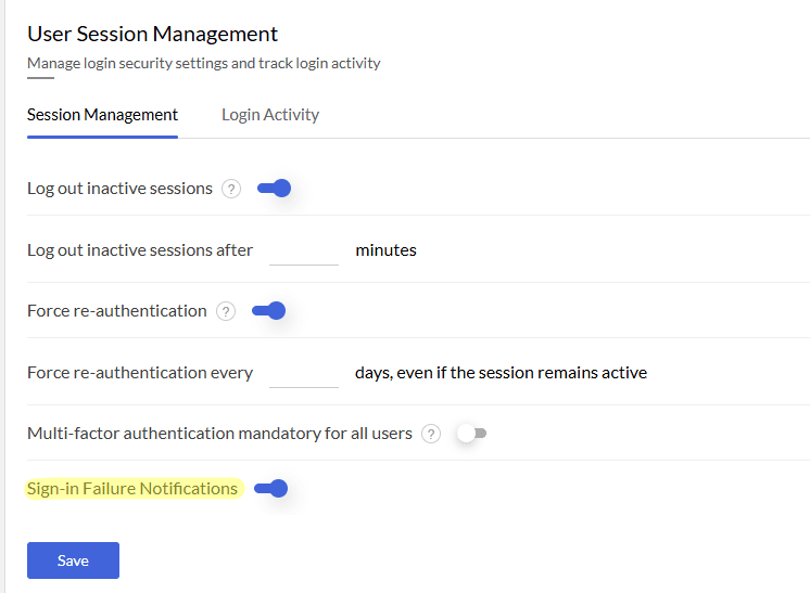 The Sign-in Failure Notification, when enabled, triggers an email to the user and admin when a login fails due to an incorrect password