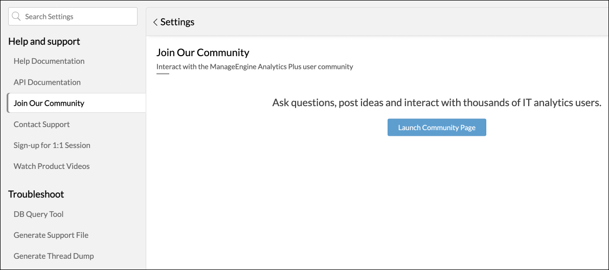 The Manage Settings page allows the Server Administrator to control all product settings. To access this page, click the Settings icon displayed on the top-right corner of your ManageEngine Analytics Plus page.