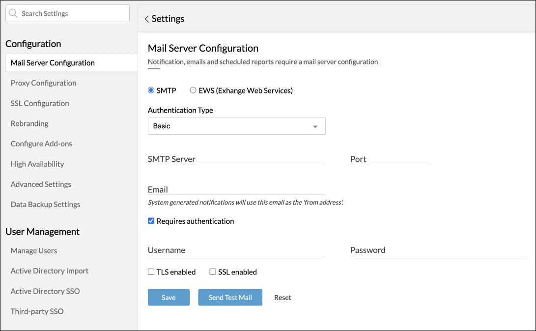 Mail server configuration allows you to trigger emails from Analytics Plus whenever a certain action is performed. You can send emails through Basic SMTP authentication, OAuth SMTP authentication, or Microsoft's Exchange Web Services. Click here to learn more about each configuration in detail.