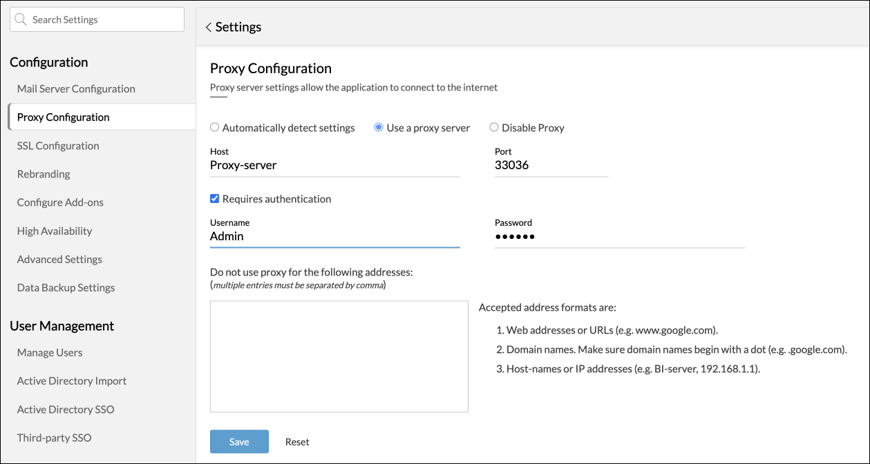 • To disable the proxy, select the Disable Proxy radio button and click Save.