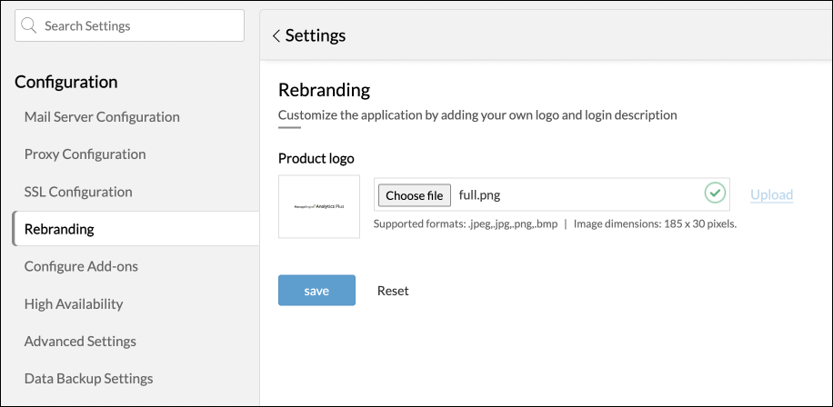 Logo rebranding allows you to customize the ManageEngine Analytics Plus product logo that is displayed within the Analytics Plus product. Follow the steps below to update the logo.