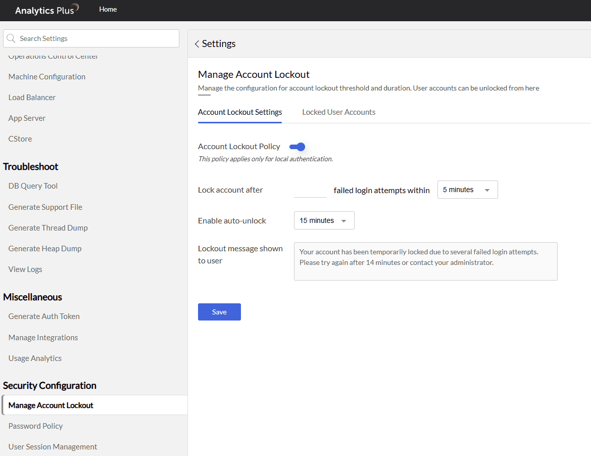 To enhance the security of your Analytics Plus application and prevent unauthorized access through brute-force login attempts, you can configure the Account Lockout Policy. This policy is applicable only to users authenticated through local authentication.