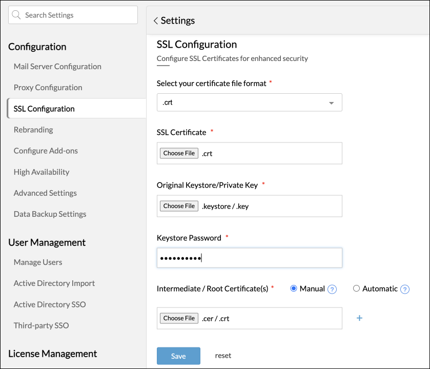 • Choose the format of your SSL certificate from the Select your certificate file format drop-down. The following are the supported file formats: .cer, .crt, .pfx, .p7b, .keystore, and .jks.
