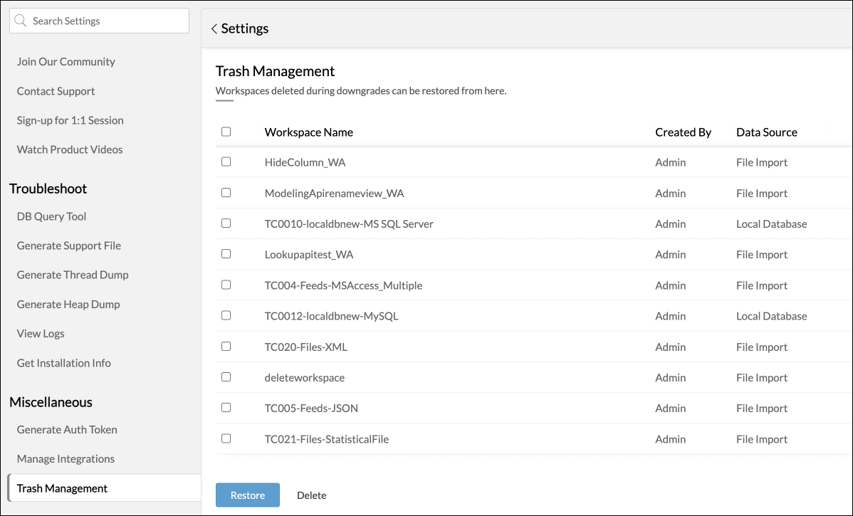 Trash Management: Workspaces deleted during downgrades can be restored from here.