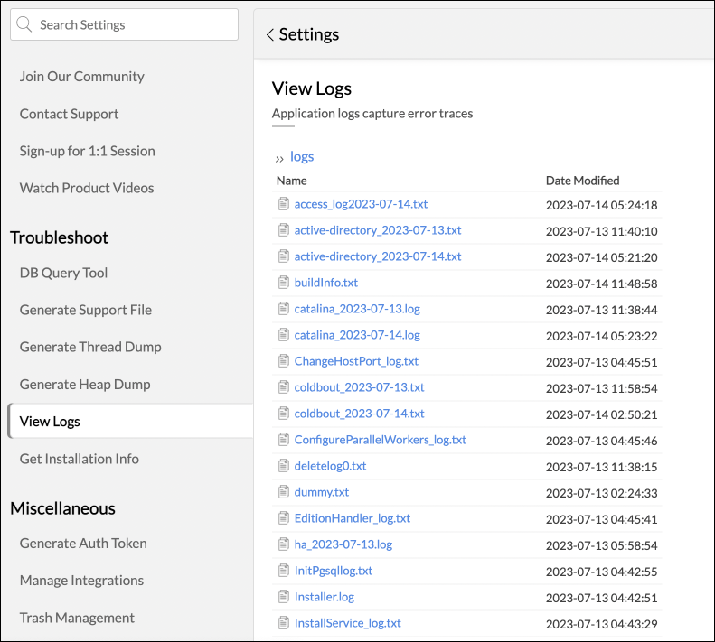 View Logs: This section allows you to view all Application logs that capture error traces.