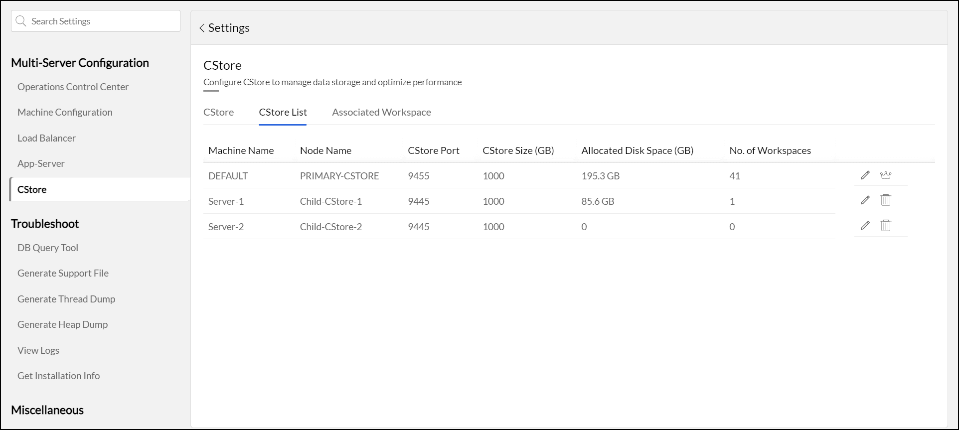 Once the child CStore node starts successfully, navigate to Settings > Multi-Server Configuration > CStore > CStore List tab; the child CStore details will be listed.
