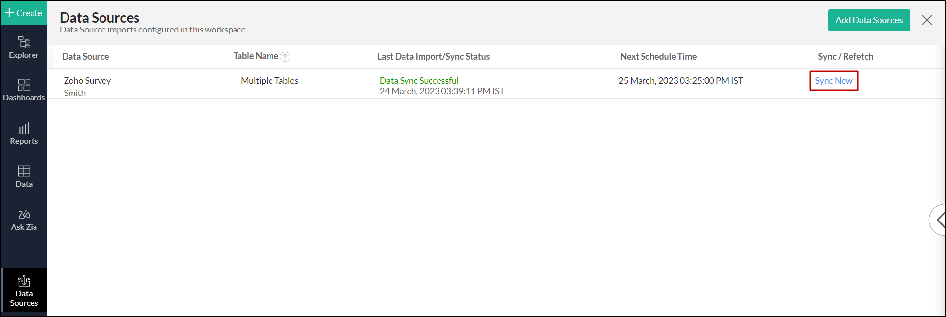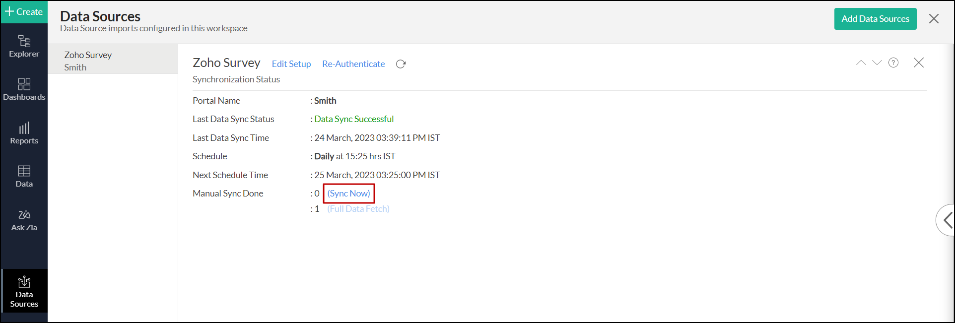 You can also access the Zoho Survey data source page, and click Sync Now.