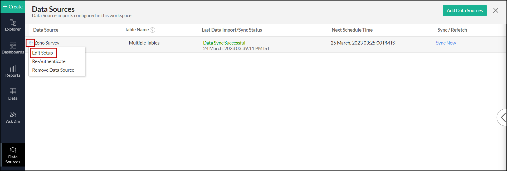 1. Click the Settings icon that appears on mouse over on the Zoho Survey data source and click the Edit Setup option.