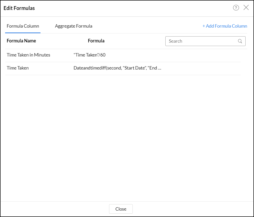 Formulas are calculations that can be defined using the powerful formula engine to create required reports. Refer this documentation to know more. There are also several default formulas created based on the Zoho Survey modules. To view the default formulas, open the required table, click Add and select the Edit Formulas option.