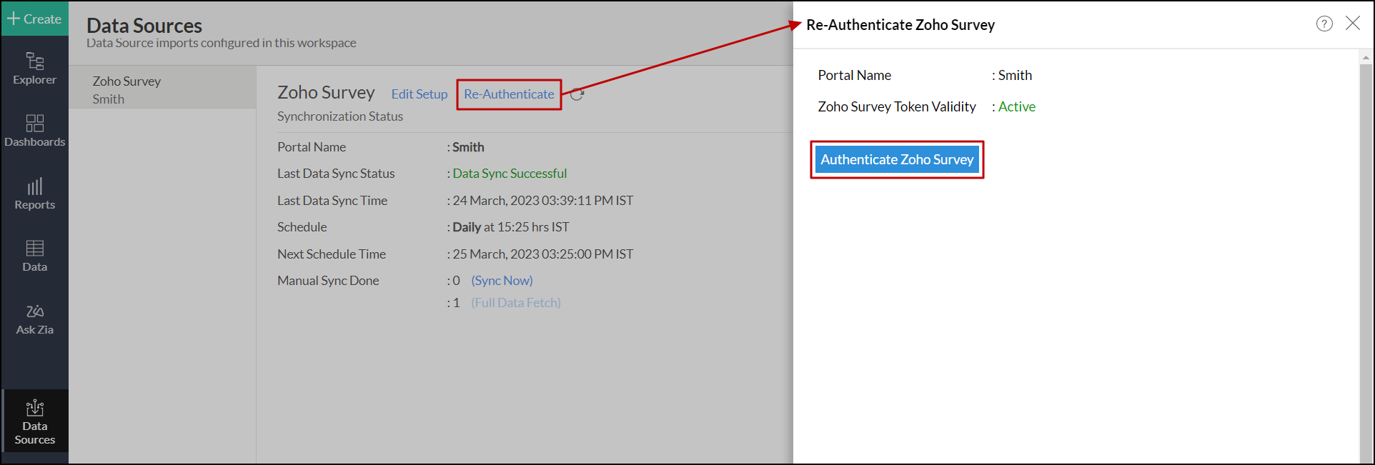 2. Navigate to the Zoho Survey data source, and click the Re-Authenticate link.
