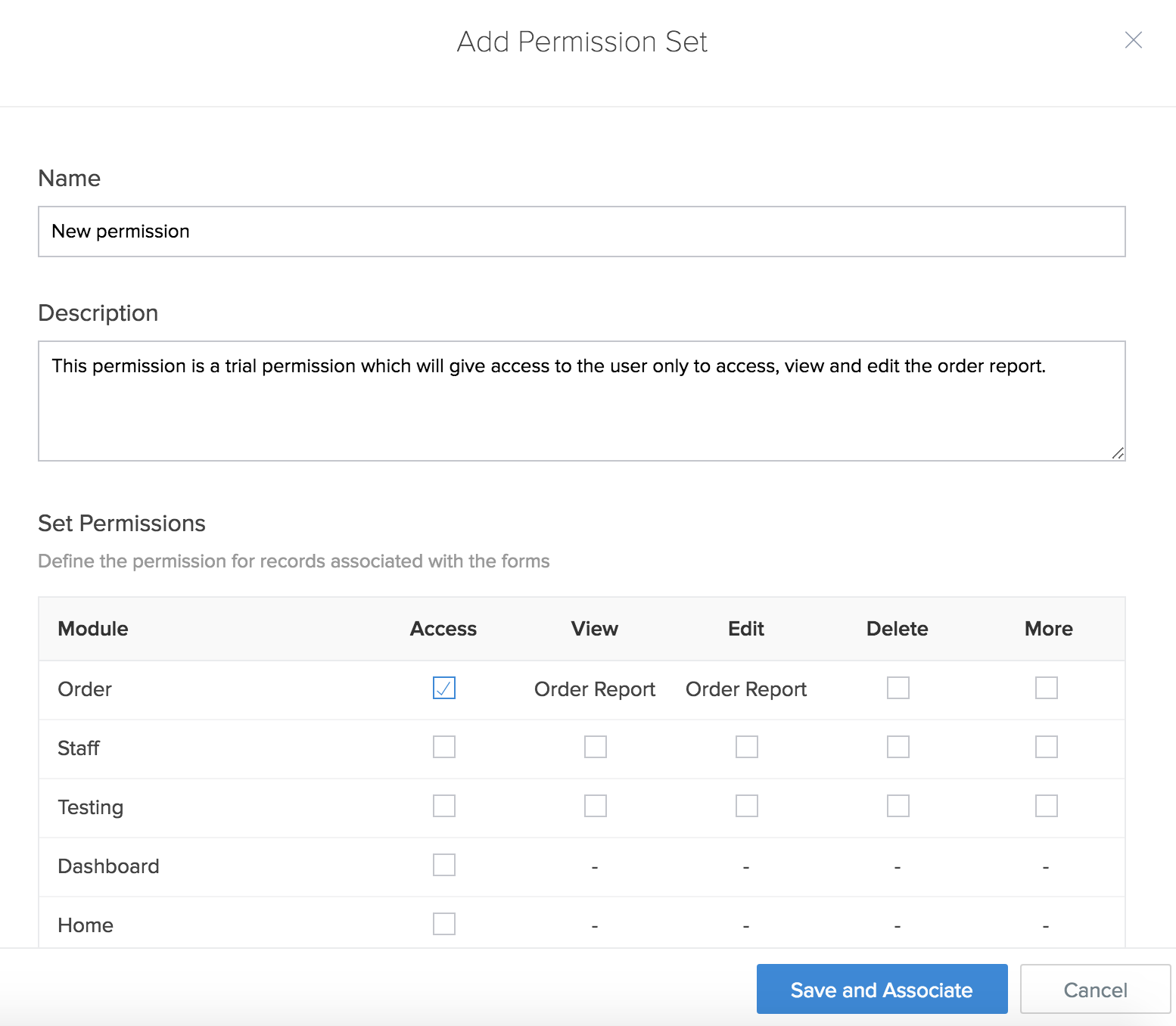 Enter the name, description and set permissions for the permission set in the Add Permission Set tab. Then click Save and Associate button