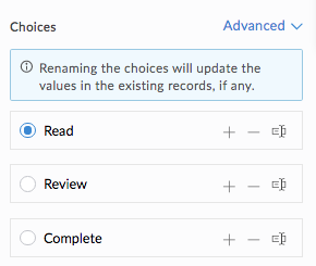 - On renaming the choices, the records with the existing values will be updated with the new choice values, wherever applicable. For instance, you have records with choice values as 'a', 'b', and 'c'. You rename 'a' to 'x'. Once this change is saved, wherever the value 'a' is found in the existing records, it will be replaced with the new value 'x'. But, the values 'b' and 'c' will remain unchanged.