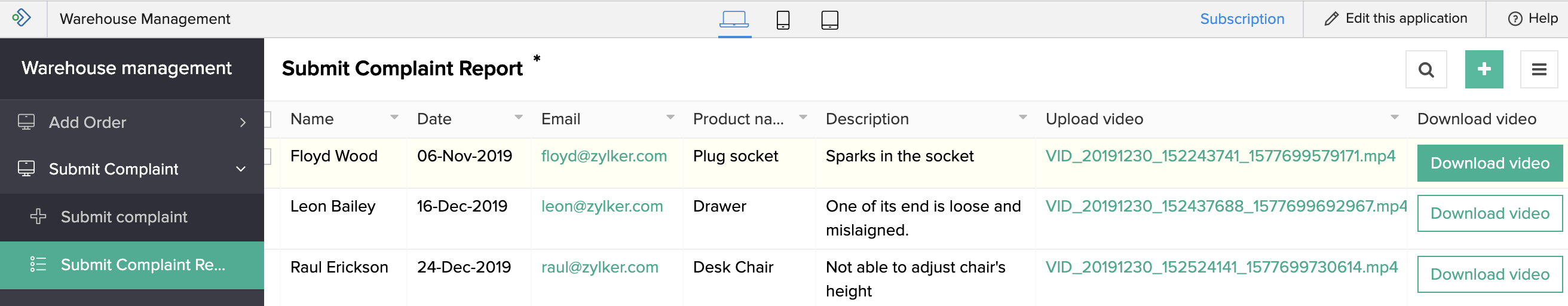 For example, imagine that you've built a Warehouse management application. In this application, you have created a form named Submit complaint, where your users can submit videos of issues pertaining to your goods in order to get a replacement. When you access the Complaints report, you may want to download the videos. To do this, you can configure a custom action in your report such that when you click the Download video button, the video file is downloaded. This custom action has the above URL format constructed as follows: