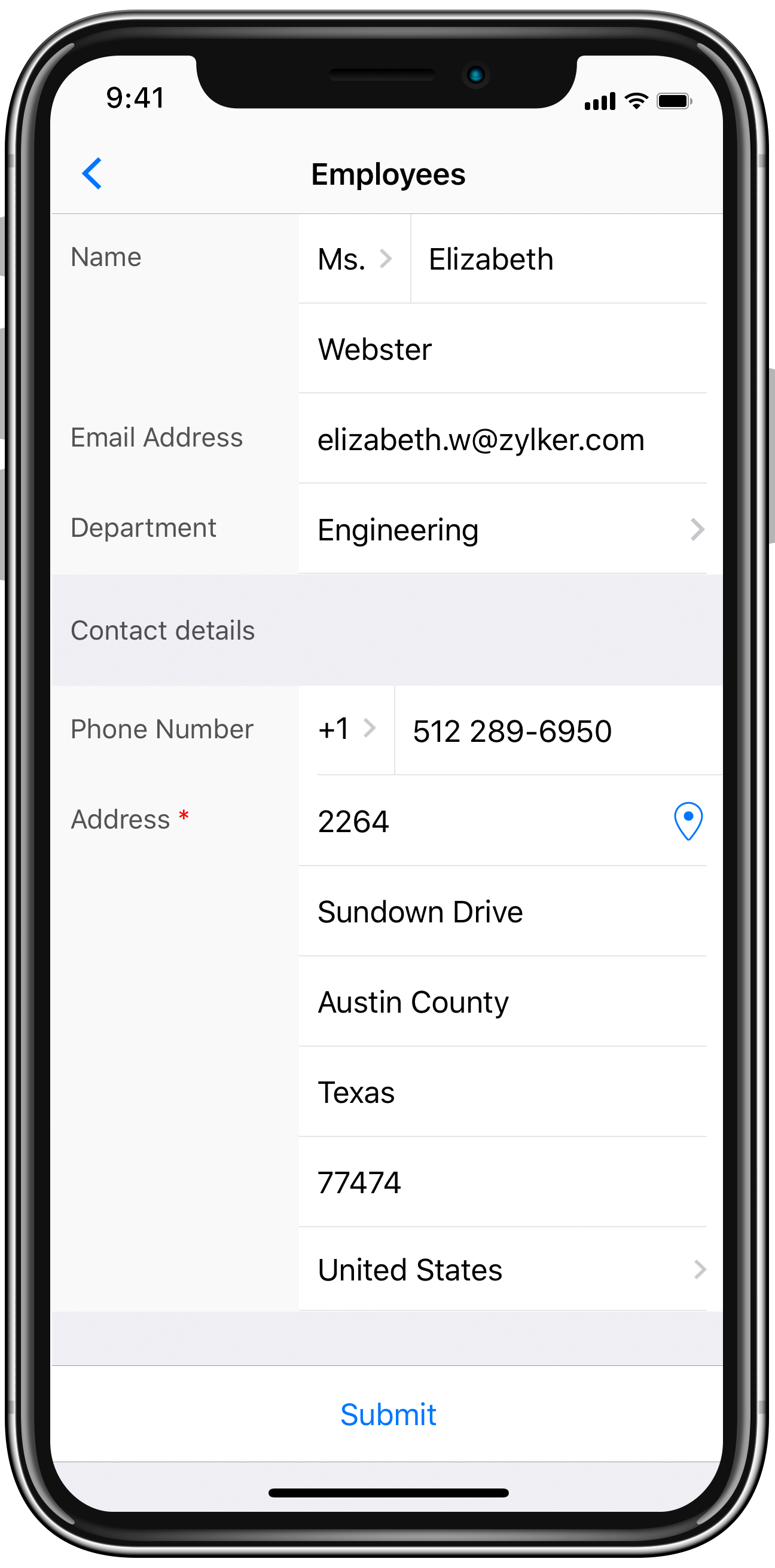 The following images show how an Employees form looks when a user accesses from a smartphone: