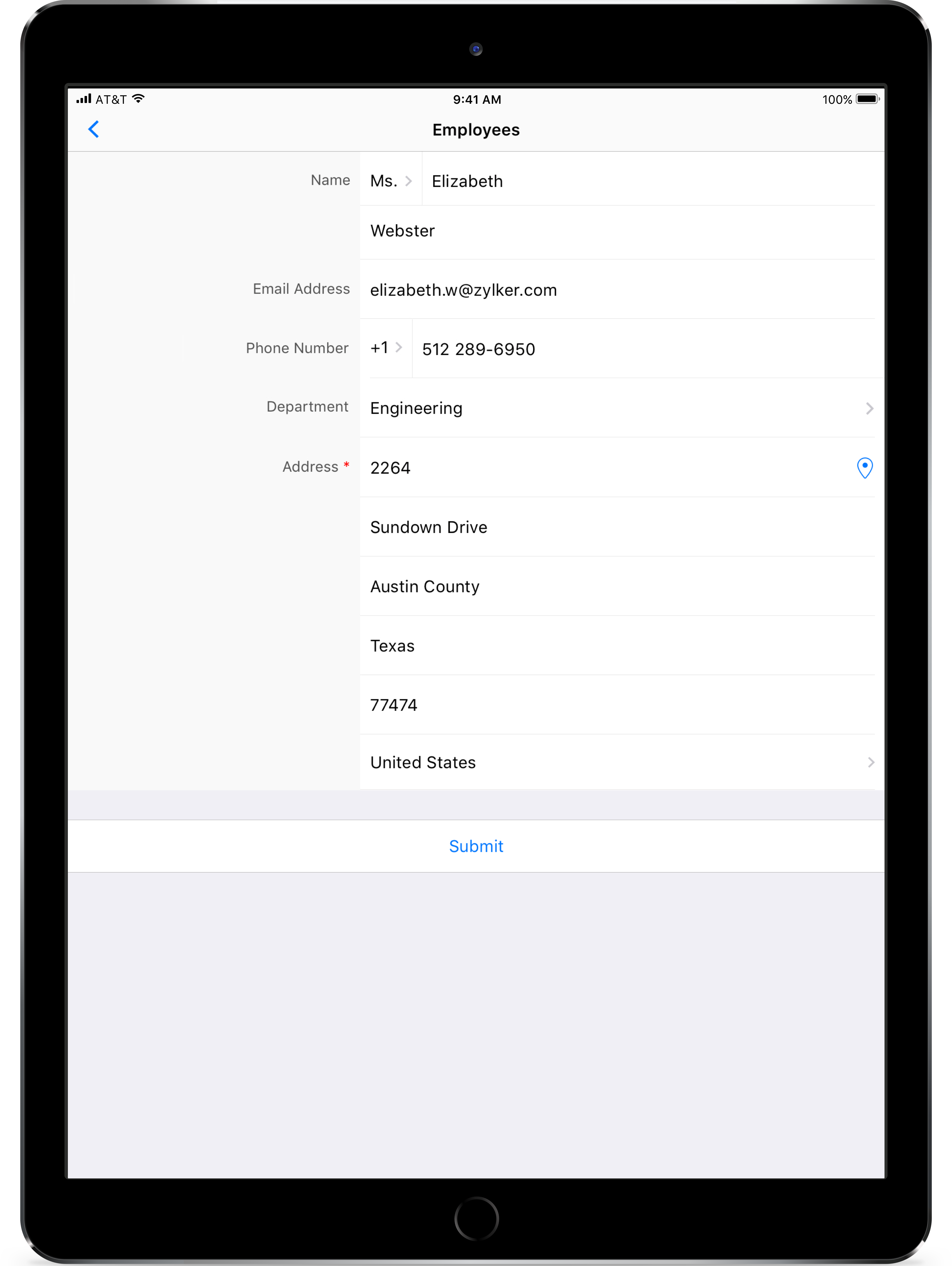 The following images show how an Employees form looks when a user accesses from a tablet: