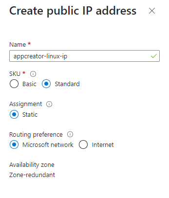 You can either choose a public IP (if you already have one) from a dropdown or click Create New. In the Create public IP address slider that appears, we recommend you choose the Standard option for SKU.