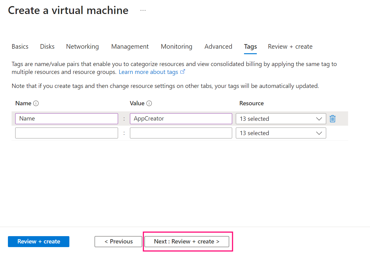 Step 11: Modify the Management, Monitoring, Advanced settings, and Tags as needed from the respective sections. In the Tags section, you can provide a name and value in the corresponding fields, select the resources as needed, and click the Next: Review + Create > button to proceed.