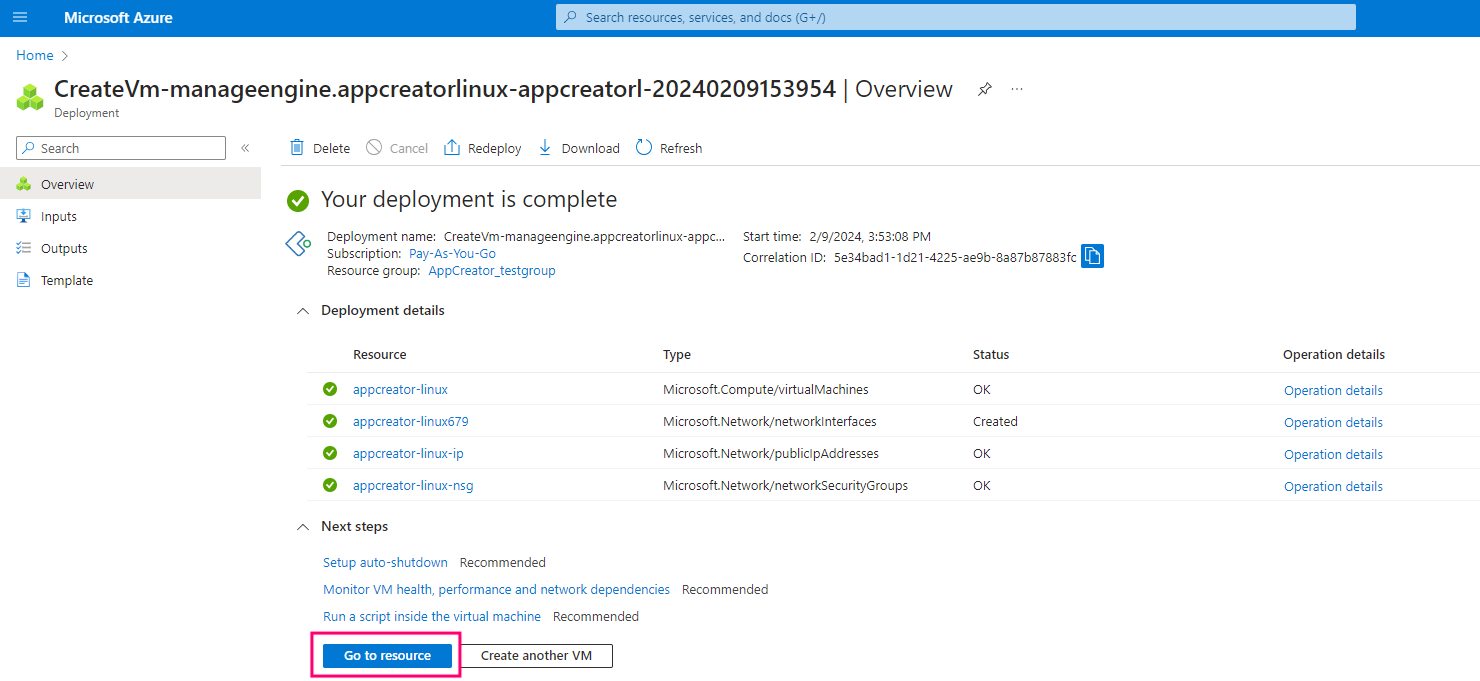 Step 13: Click the Go to resource button to access your virtual machine details after the deployment is complete.