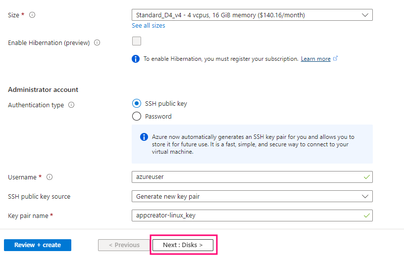Step 8: Provide the required instance details, and ensure you select a VM size based on your requirements and AppCreator's recommended configuration. Specify an administrator account and proceed to the next step by clicking the Next: Disks > button.